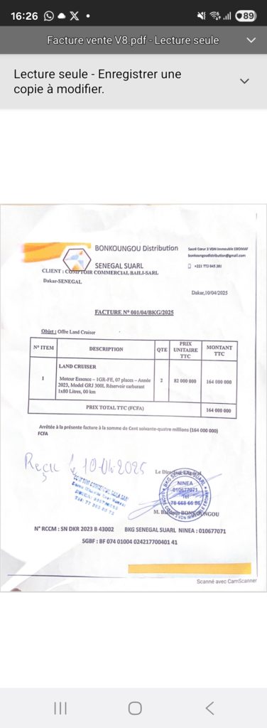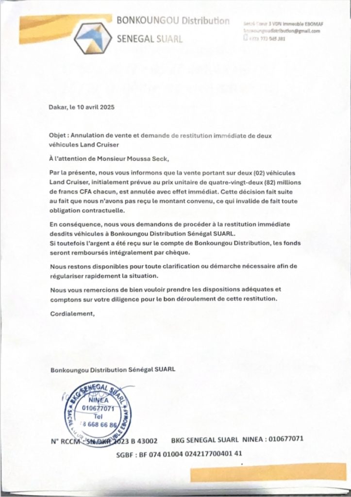 En effet, six mois après les faits, aucun fonds n’a été déposé sur le compte SGBS de Bonkoungou Distribution, et la Société Générale Sénégal peut confirmer ou infirmer ces faits.