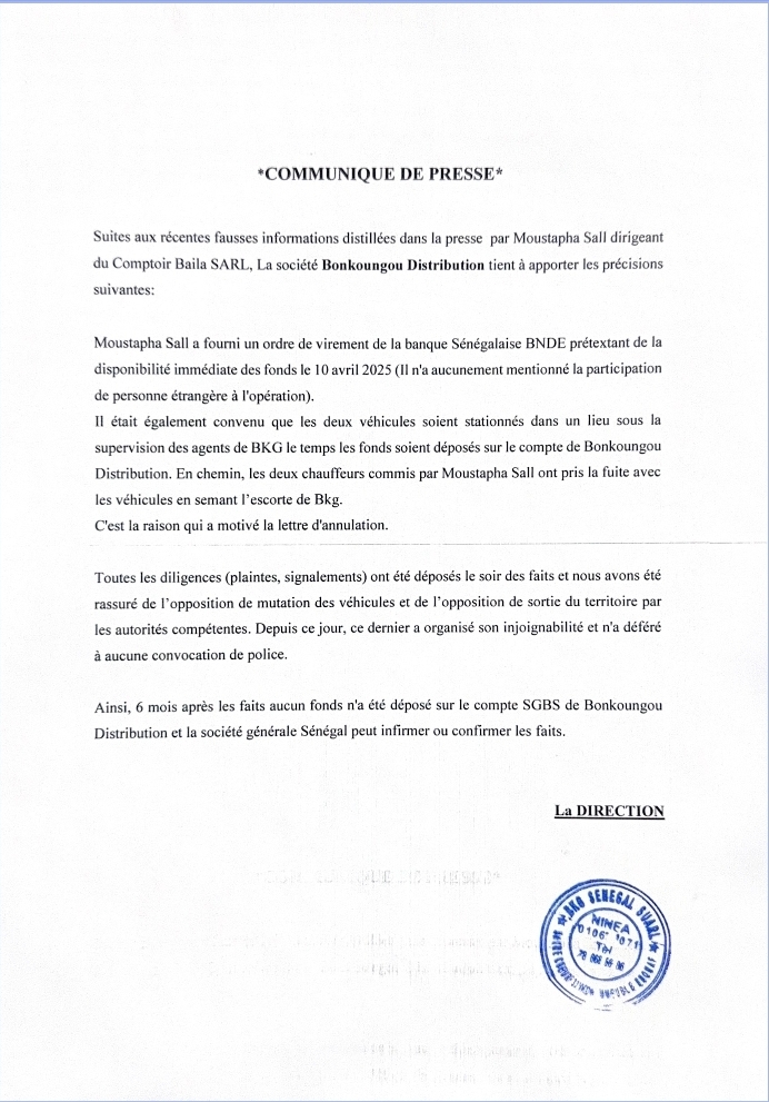 Après des allégations jugées fausses, Bonkoungou Distribution à travers un communiqué parvenu à la rédaction de Dakarois 221 répond à des informations jugées fausses diffusées par Moustapha Sall du Comptoir Baila SARL et apporte les précisions suivantes :