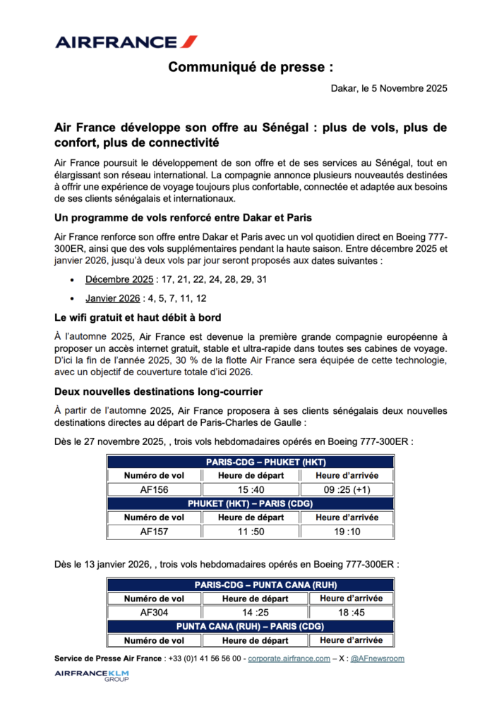 La compagnie française Air France agrandit son offre au Sénégal, intensifiant ainsi sa présence au Sénégal avec une série d’innovations et d’améliorations destinées à répondre à la demande croissante des voyageurs sénégalais et internationaux.