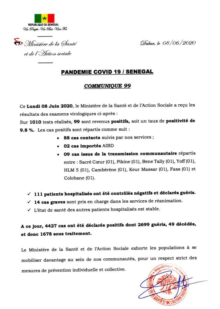 Dans sa communication de ce lundi 8 juin 2020, le ministère de la Santé et de l’Action sociale a confié que le Sénégal a enregistré 99 nouveaux positifs
