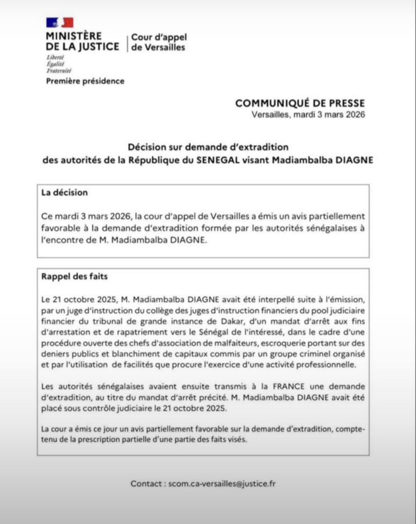 Ce mardi, la Cour d’appel de Versailles a rendu un avis “partiellement favorable” concernant l’extradition de Madiambal Diagne.