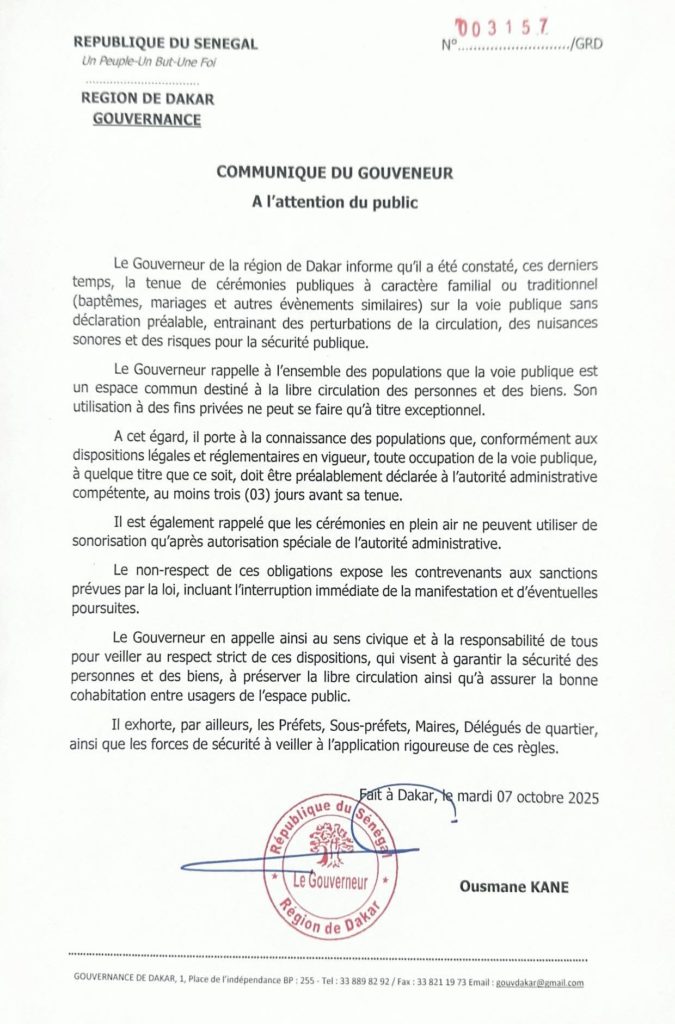 Le Gouverneur de la région de Dakar, Ousmane Kane, alerte sur la multiplication de cérémonies familiales et traditionnelles organisées sur la voie publique sans autorisation préalable. Il rappelle que ces pratiques entraînent des perturbations de la circulation, des nuisances sonores et des risques pour la sécurité publique.