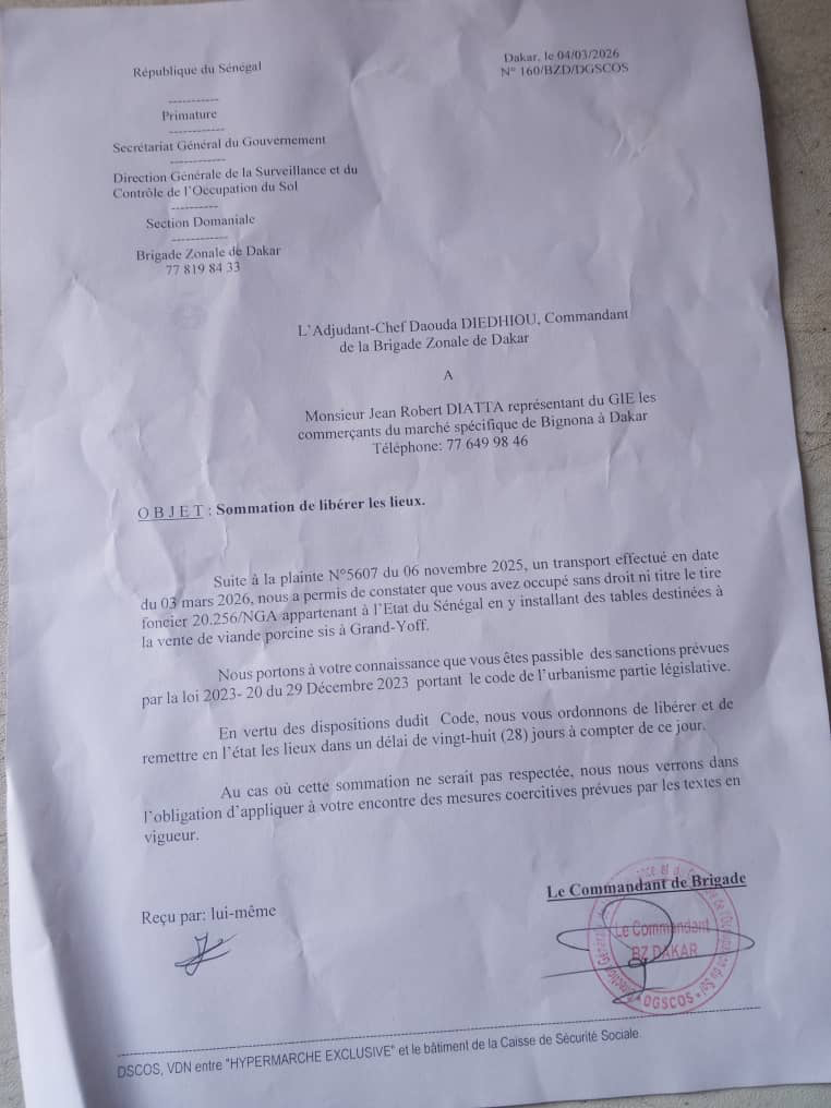 Un avis de déguerpissement vient d’être adressé aux commerçants du marché de viande porcine de Grand-Yoff. On leur donne vingt-huit (28) jours pour quitter les lieux au motif que le site est situé sur un titre foncier appartenant à l’État.