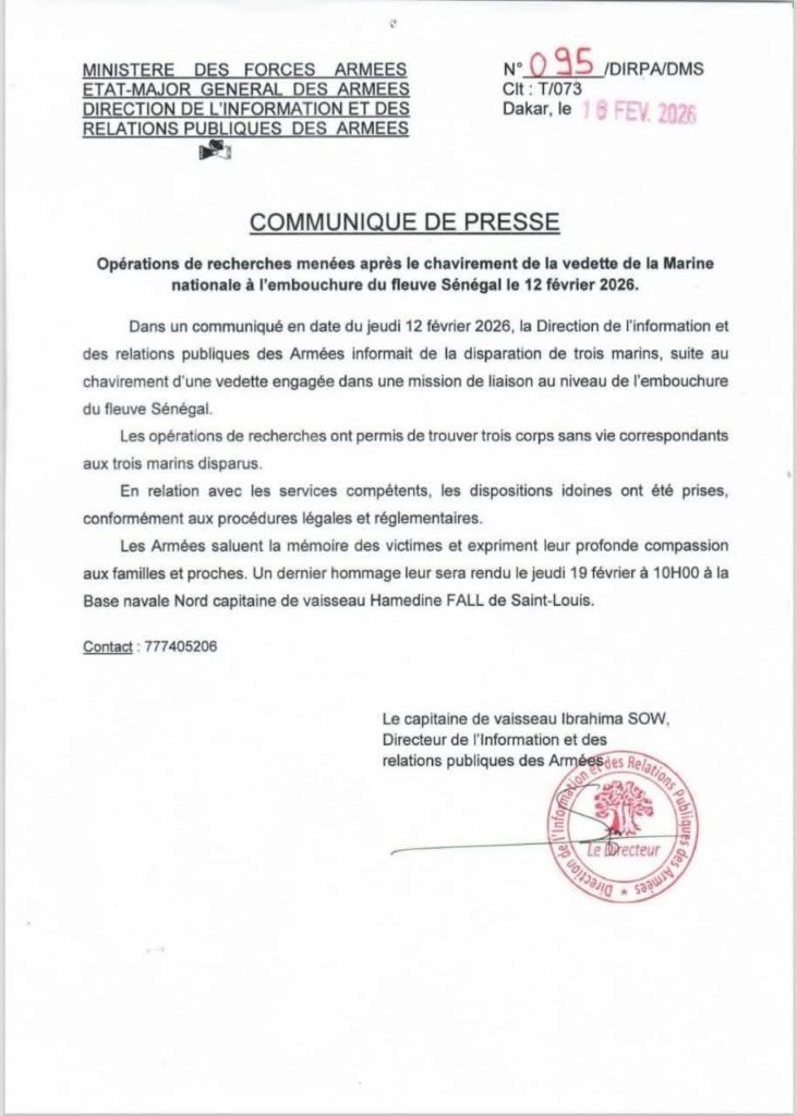 Dans un communiqué rendu public le jeudi 12 février 2026, la Direction de l’information et des relations publiques des Armées (DIRPA) avait informé de la disparition de trois marins à la suite du chavirement d’une vedette engagée dans une mission de liaison dans la zone de l’embouchure du fleuve Sénégal.