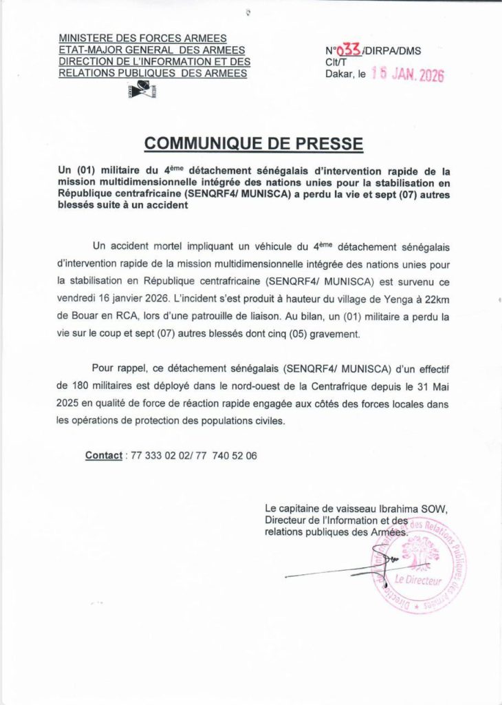 La Direction des relations publiques des armées, a annoncé qu’ un militaire du 4ème détachement sénégalais d’intervention rapide de la mission multidimensionnelle intégrée des nations unies pour la stabilisation en République centrafricaine (Munisca) a perdu la vie, tandis que sept autres ont été blessés.