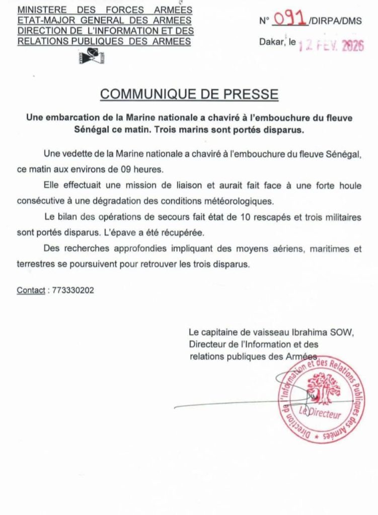 Ce jeudi 12, une embarcation de la Marine nationale a chaviré à l’embouchure du fleuve Sénégal, lors d’une mission de liaison. Selon le communiqué de la Direction des Relations Publiques des Armées (DIRPA), la vedette aurait été confrontée à une forte houle provoquée par une brusque dégradation des conditions météorologiques.